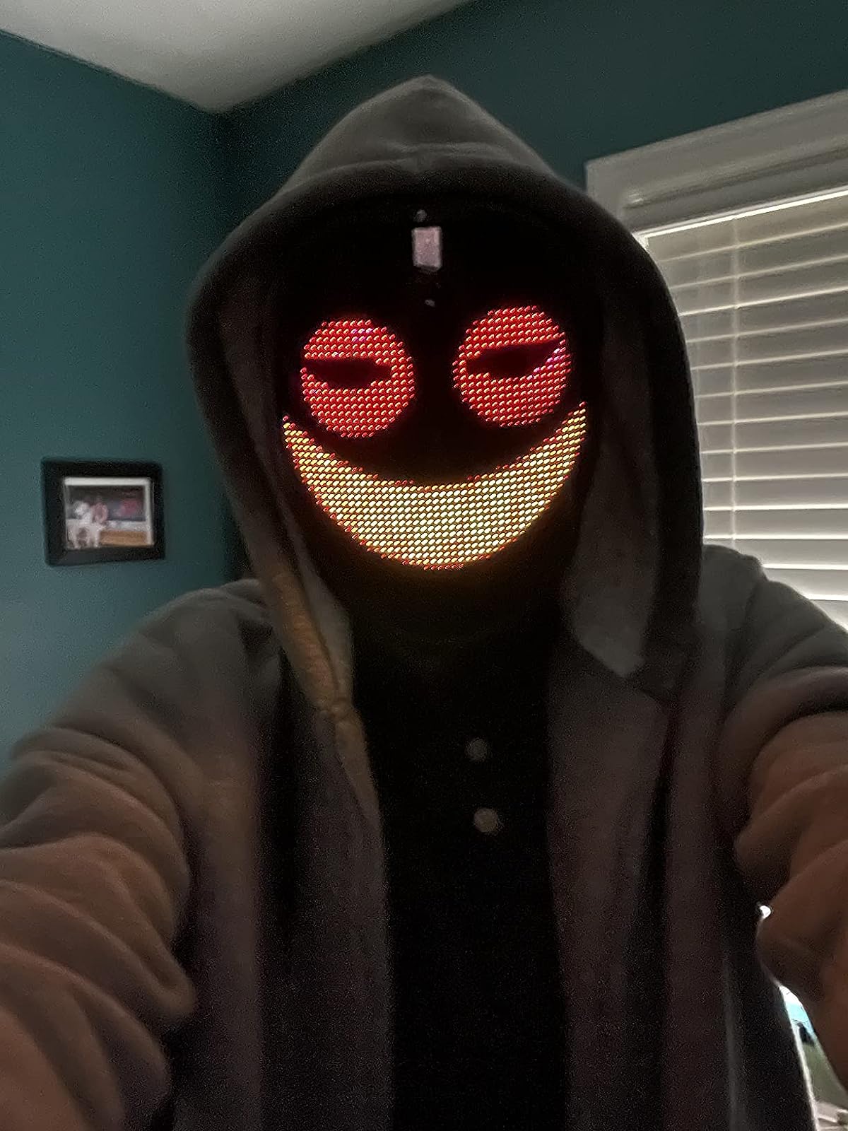 I bought this mask for myself! This mask is awesome! We are ready to party! After I installed the batteries , I tried and turned then on and made sure it worked properly. I am worried that it may be uncomfortable, but in fact it is not bad. It is not very thick snd come with silicon pad for the eyes (very comfortable!). You can breath normally, see things normally, and adjust the size of the mask strap. The most important thing for me is that I like it very much. The mask can be customised through the application Shining Mask, through following functions: user-programmable creation. uploading patterns, and a variety of patterns for selections. There is no doubt that people who like to go to parties, costume shows, music festivals, and Christmas can buy them, and they are more worth buying than ordinary glowing masks. I gave this cute mask 5 stars because it fully met my expectations. The LED patten on the mask in the dark looks cool!