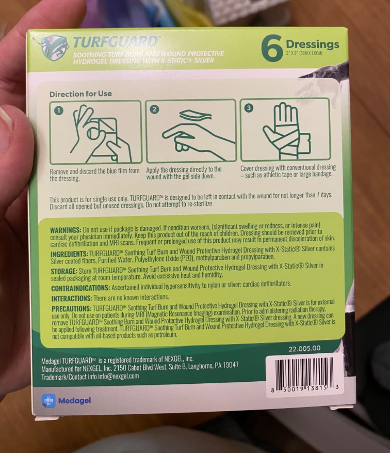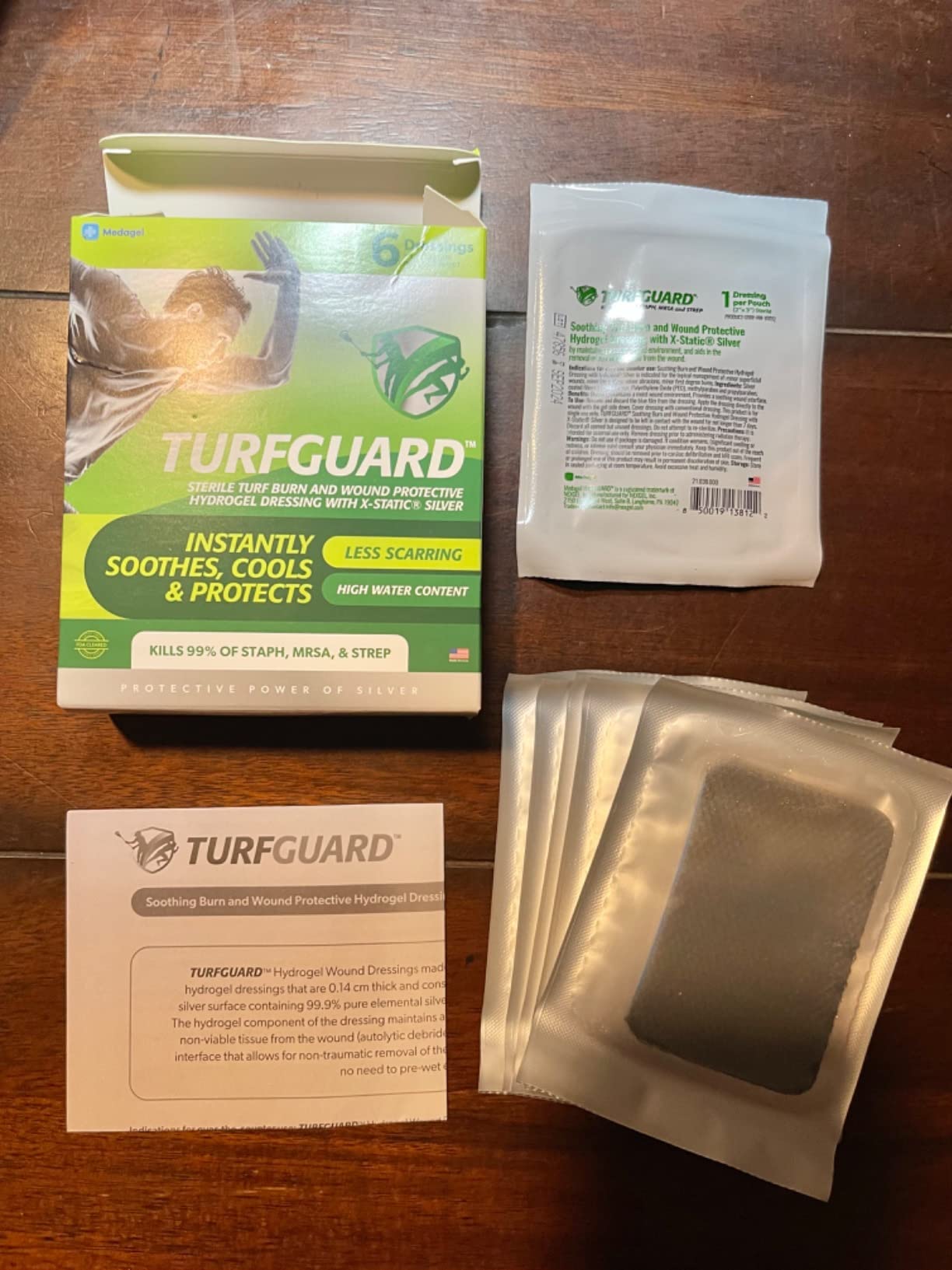 Must have for turf burn! Easy to apply! Soothes the wound and helps with the burn. Great protection.