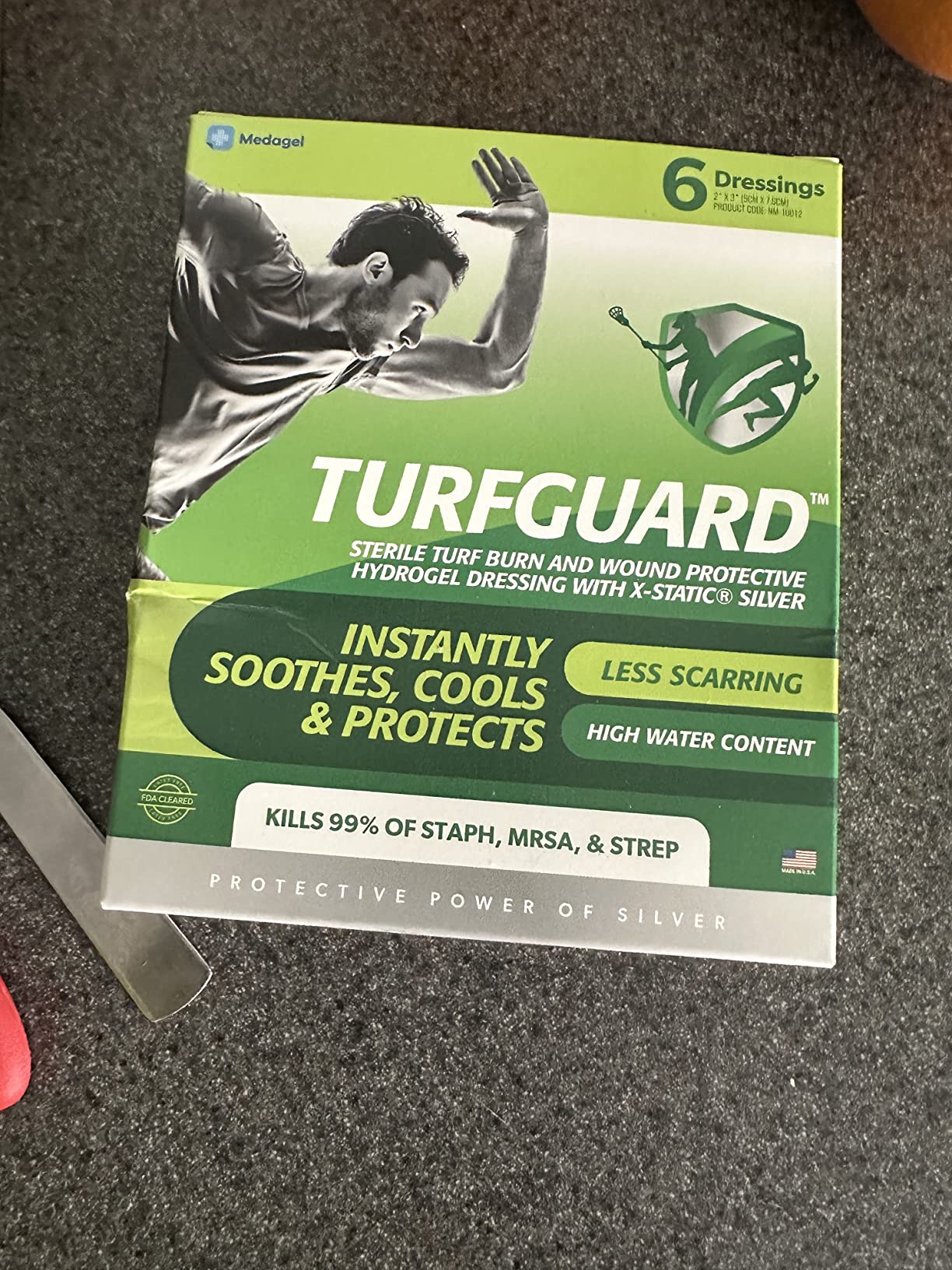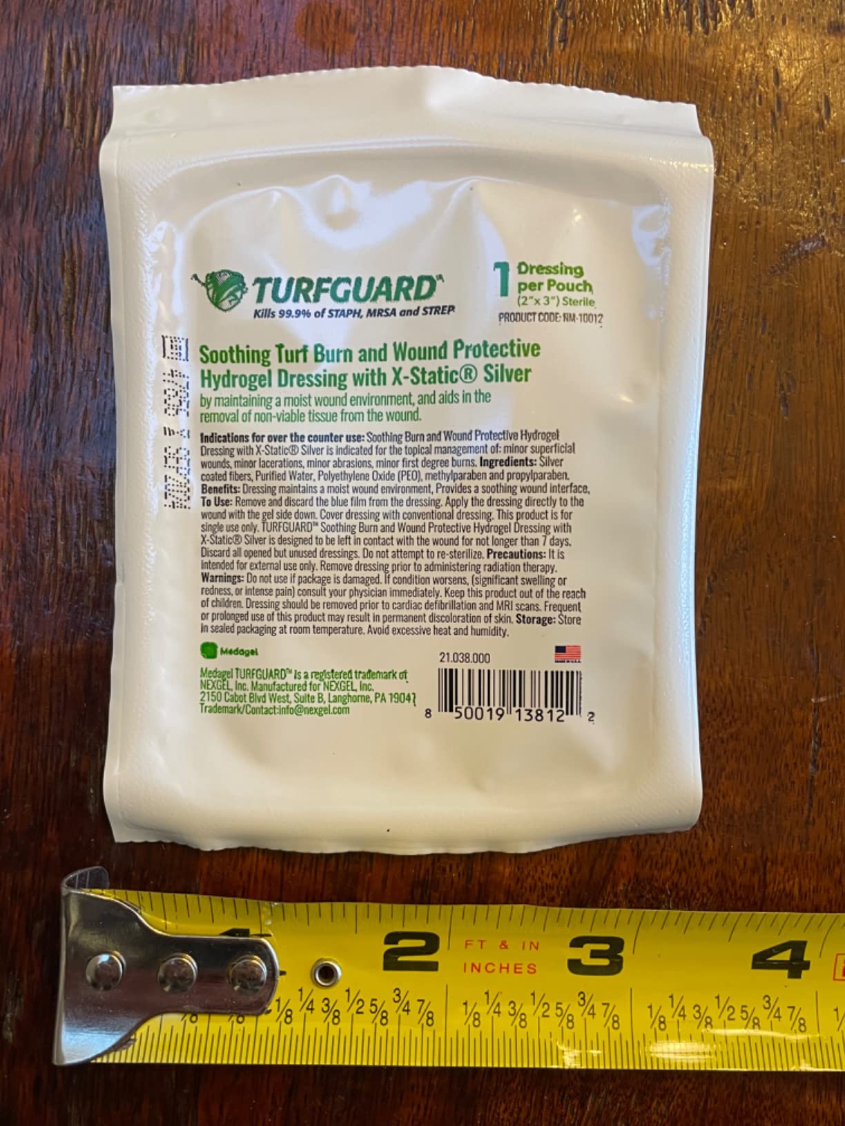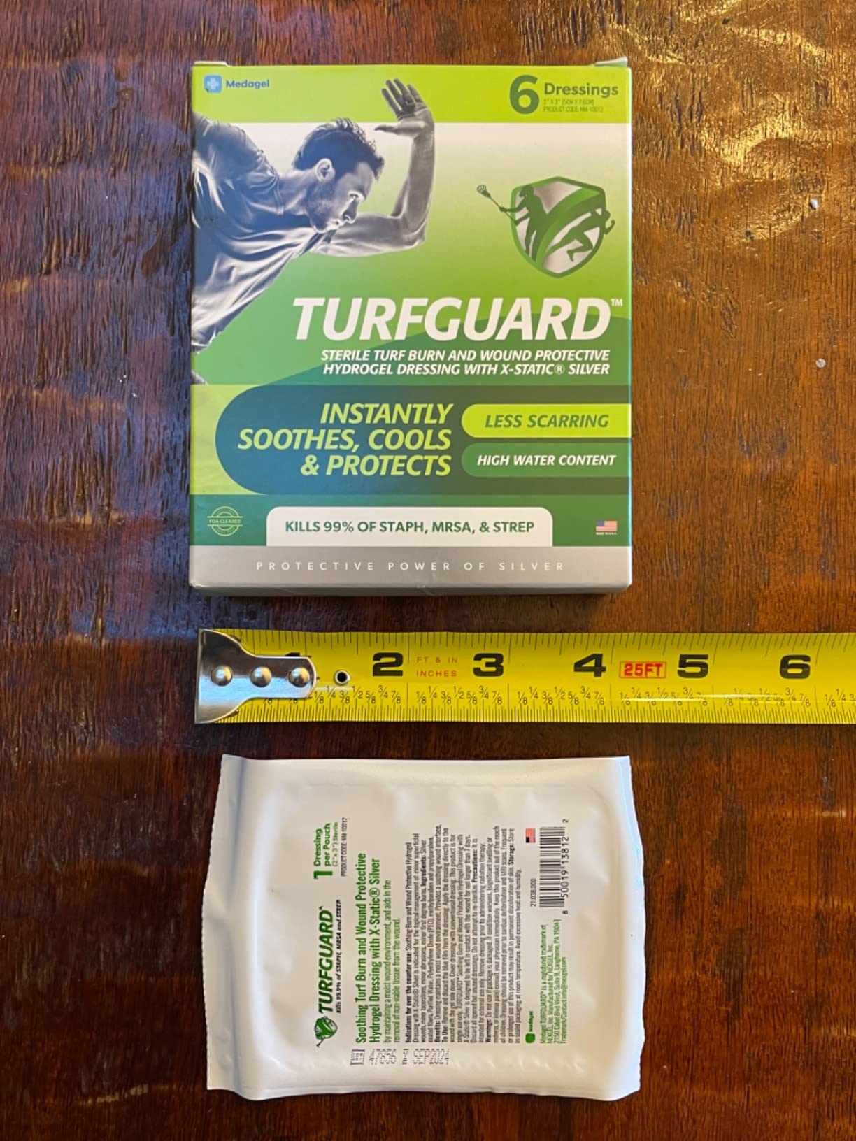 As physically active as our kids are, we keep a medical kit ready for all situations. Having gauze and bandages of all sizes is a must. I’m adding this TurfGaurd dressing as an alternative option for rug burns which they’re very prone to do, and now we’re adding gymnasium floor burns to the list due to inside sports. These are difficult to treat considering the larger area of open skin wound, so TurfGaurd is a no brainer. I like that the gel side of the dressing goes directly on the wound (after cleaning) so we don’t have to worry about gauze threads sticking anymore. This product could be kept on the wound for up to seven days, but we don’t do more than a couple days to allow for the initial pain & healing, then it needs to be exposed to air for natural care.