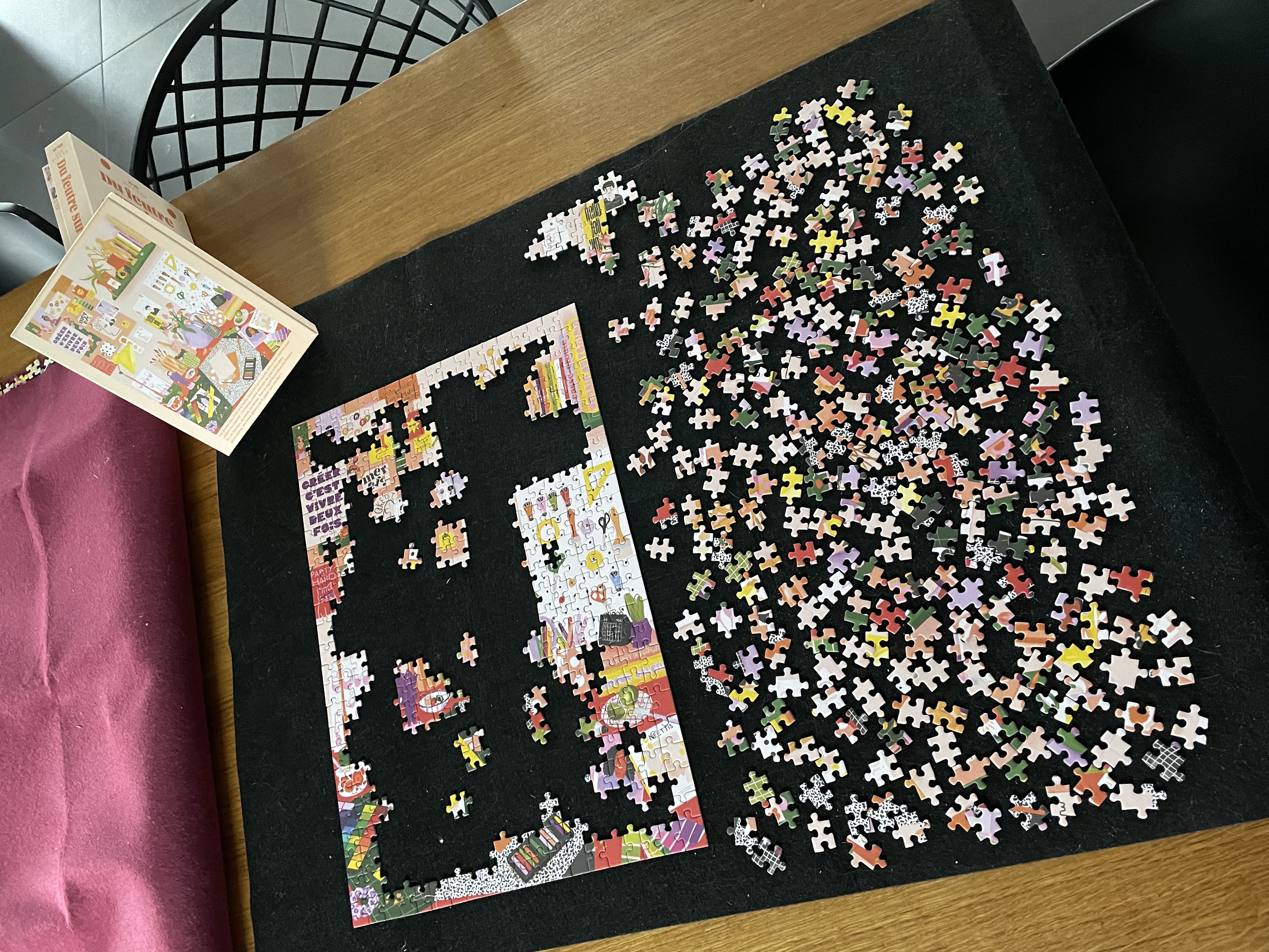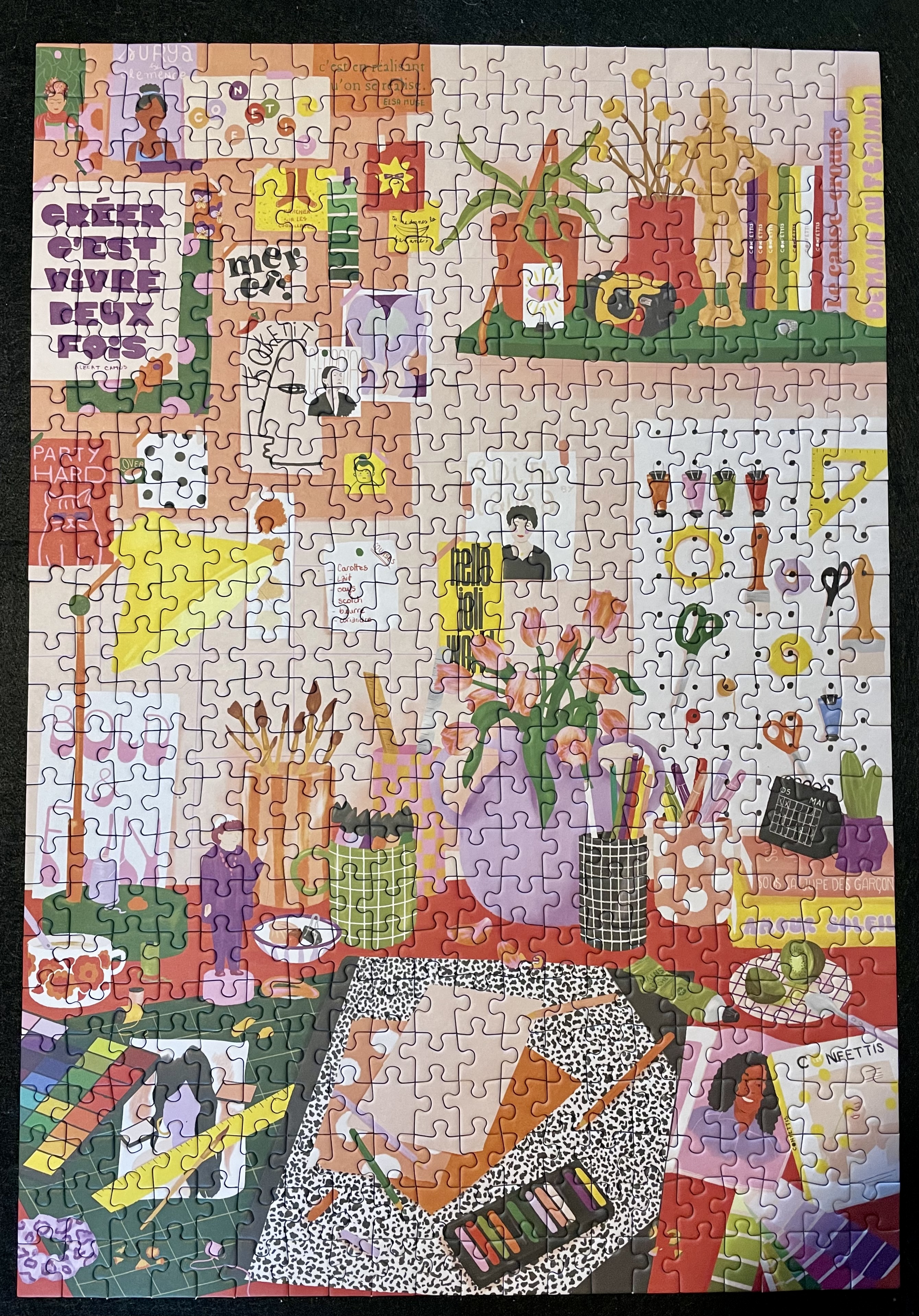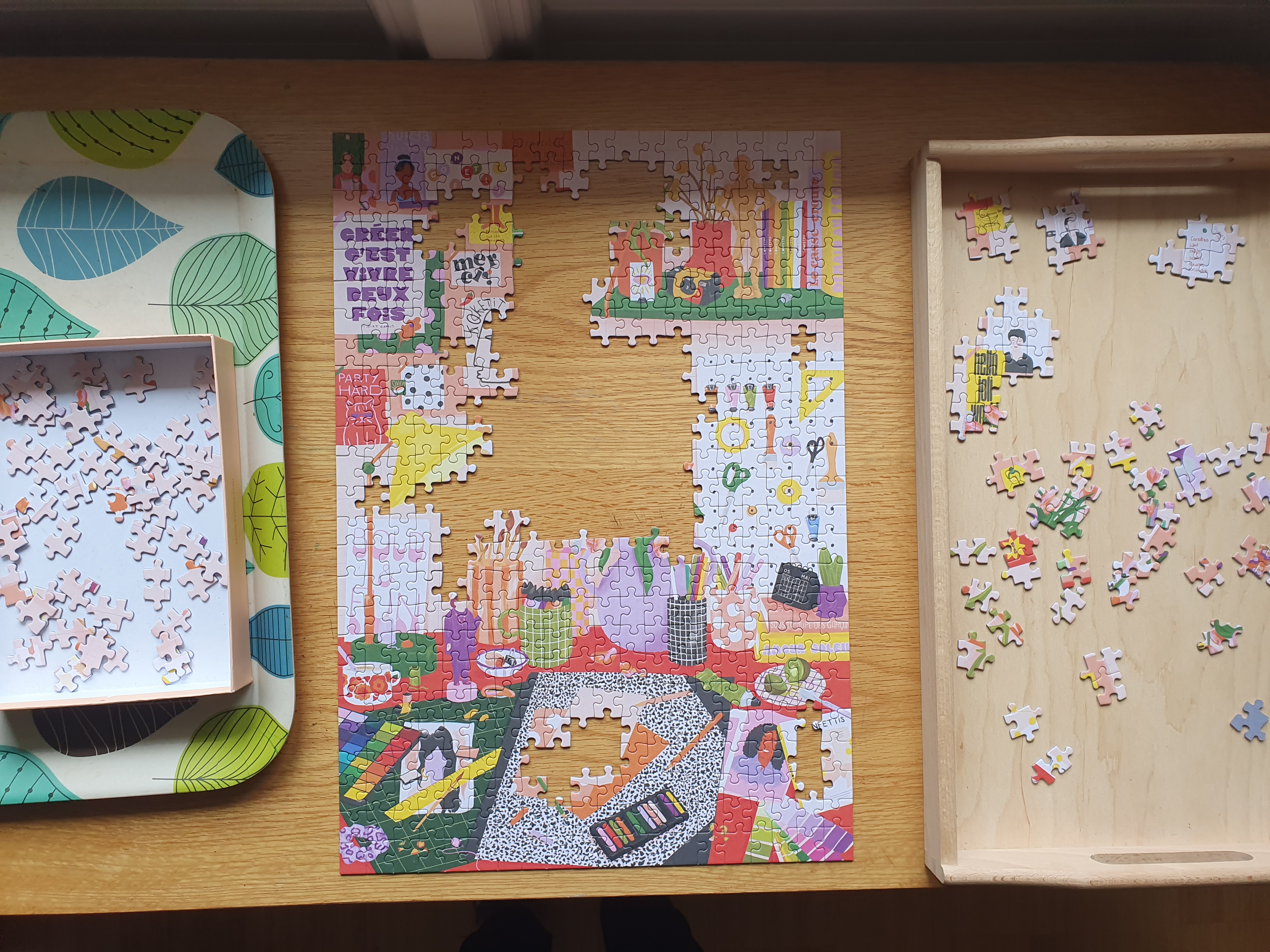 J'avais hâte que ce puzzle revienne en stock car le sujet me plaisait vraiment beaucoup. Pour augmenter un peu la difficulté je l'ai fait sans regarder le modèle et c'était très chouette de découvrir tous les petits détails. J'aime beaucoup l'aspect doux et velouté des pièces, et j'ai apprécié qu'elles ne soient pas rangées dans une pochette plastique. Tout bon pour Jour Férié !